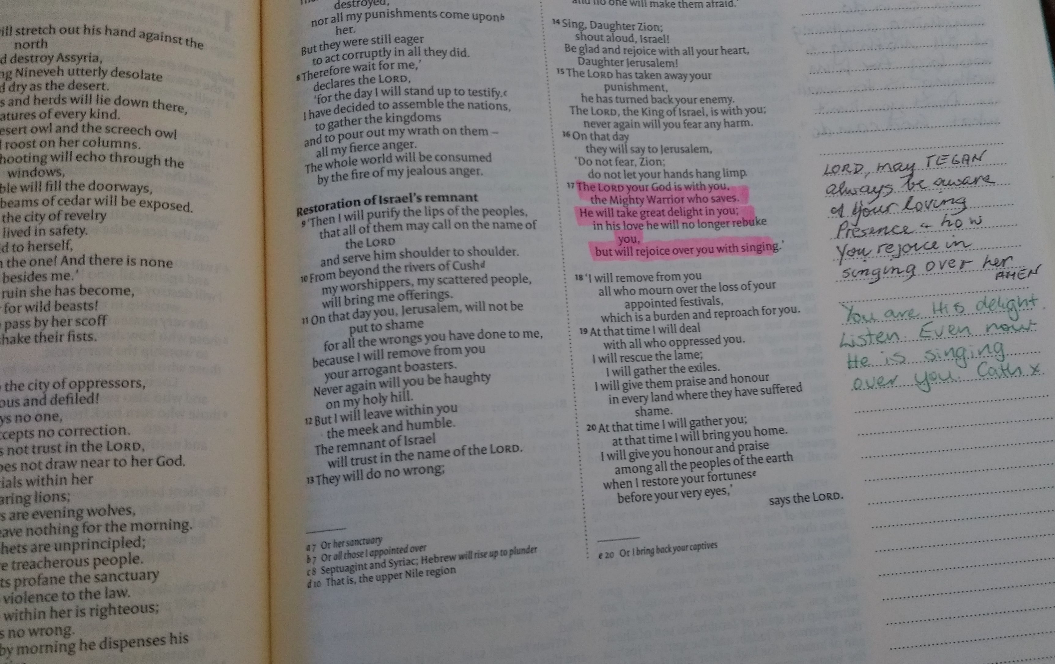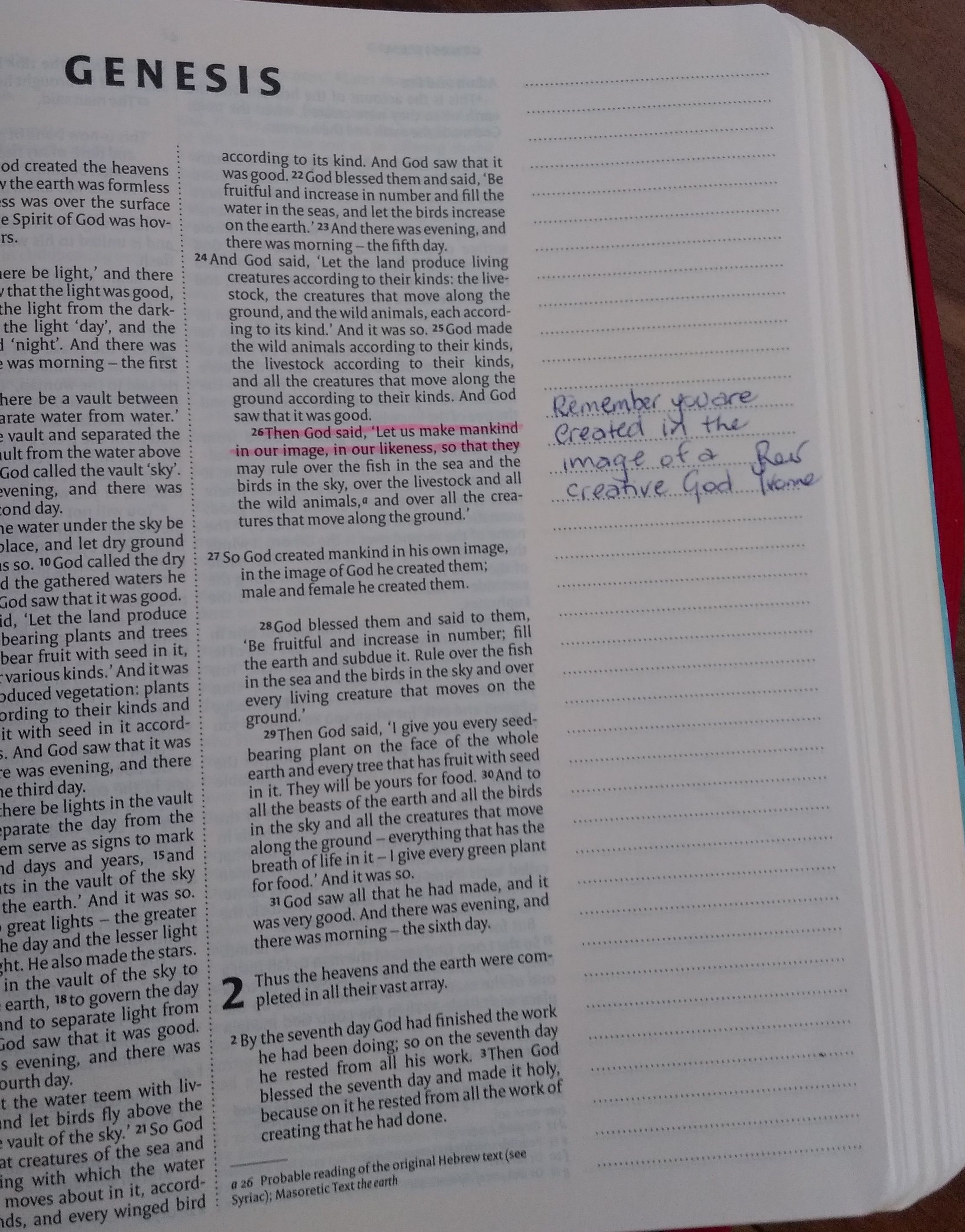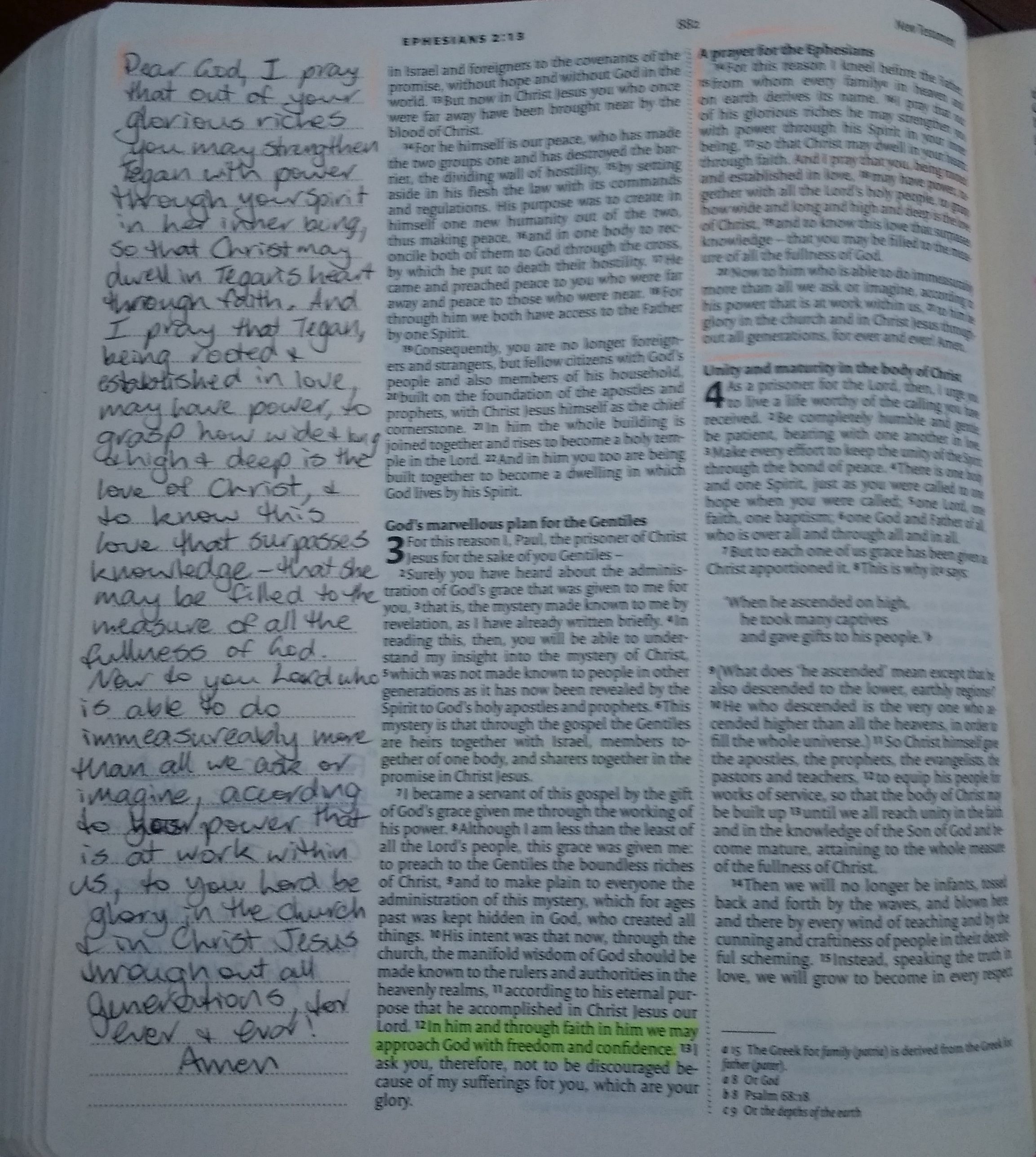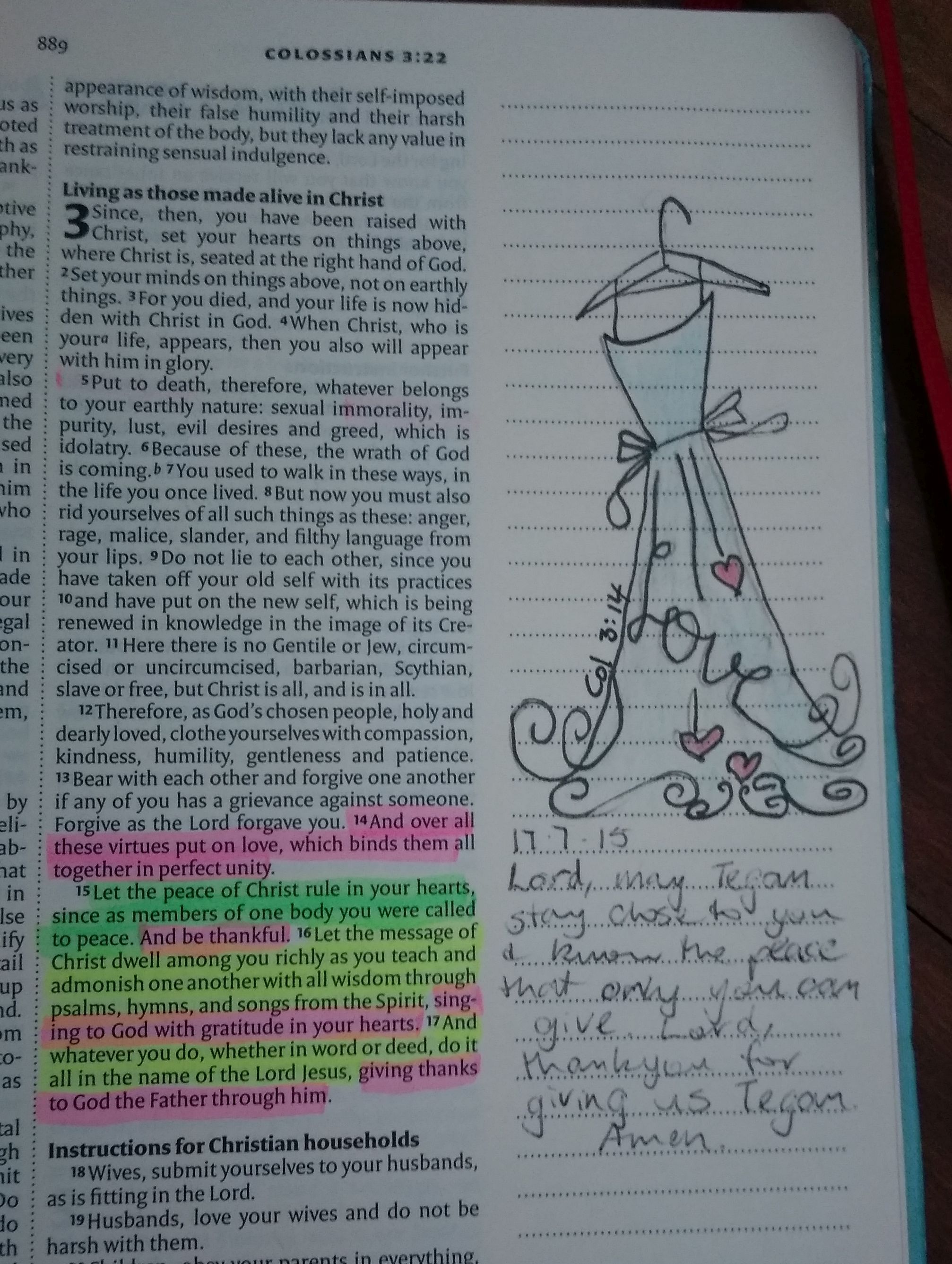 We want to pass our faith onto our children. This post by Sam Luce reminded me that I had started the following post but never published it. When my daughter graduated from high school at the end of 2015 we presented her with a Bible. This was a journalling Bible that I had highlighted verses in and written messages & prayers for her over the year or so before we gave it to her. My husband had also added to it a bit. We also asked 7/8 women from church and a few other special people to highlight verses and write in it as well.