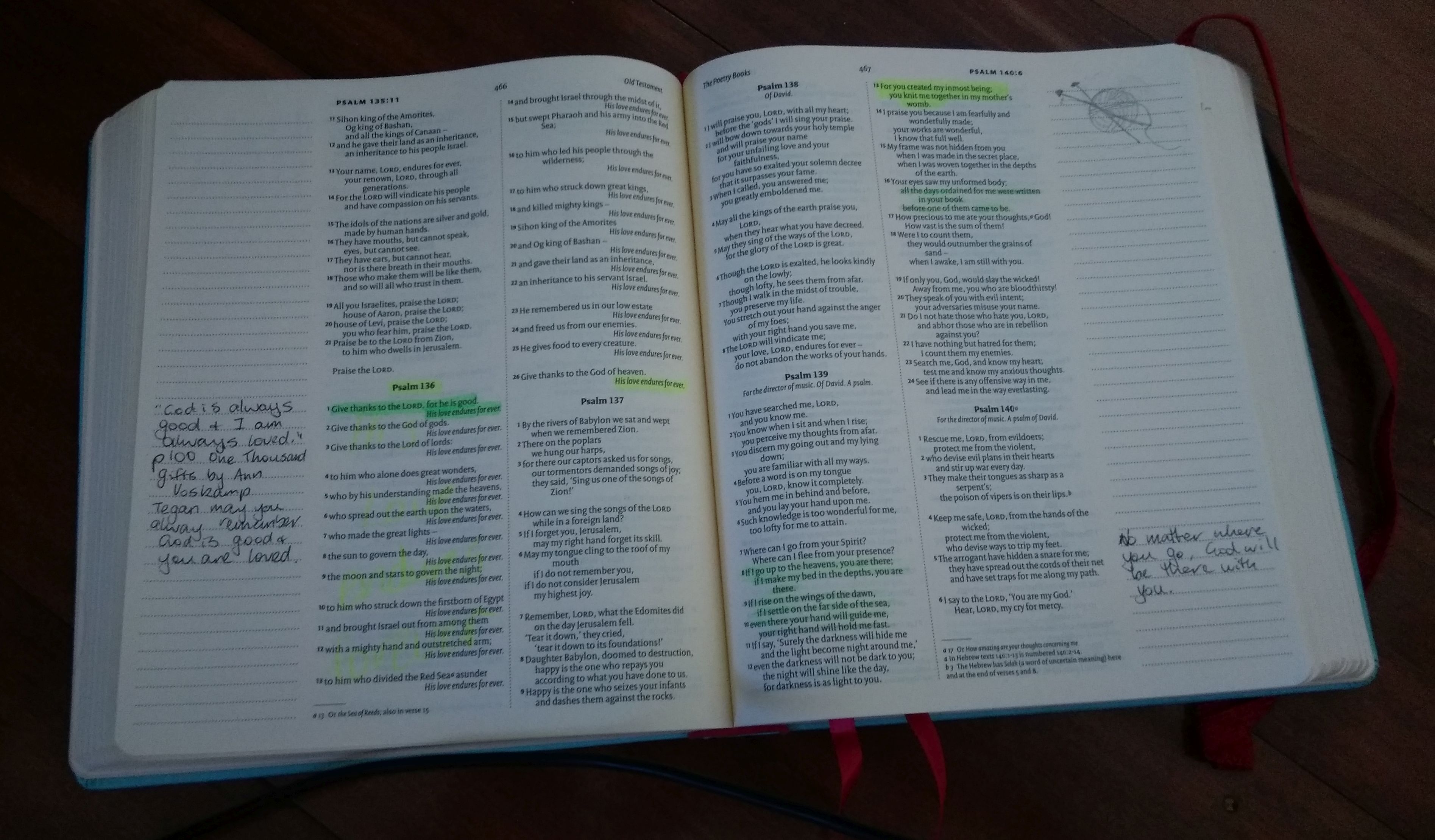 I’m not sure how many of the highlighted passages my daughter has found yet or how many she has read. I figure that it is something that she will have to look back on, at the right time. I do know that this is the Bible that she takes on camps with her now.